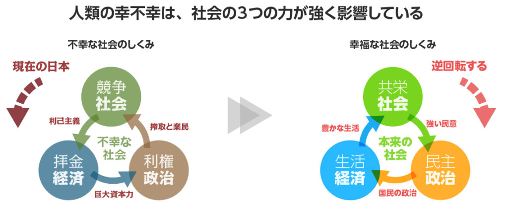 - 左側(不幸な社会): なぜ「競争社会」「利権政治」「拝金経済」が悪循環し、私たちから豊かさを奪うのか?